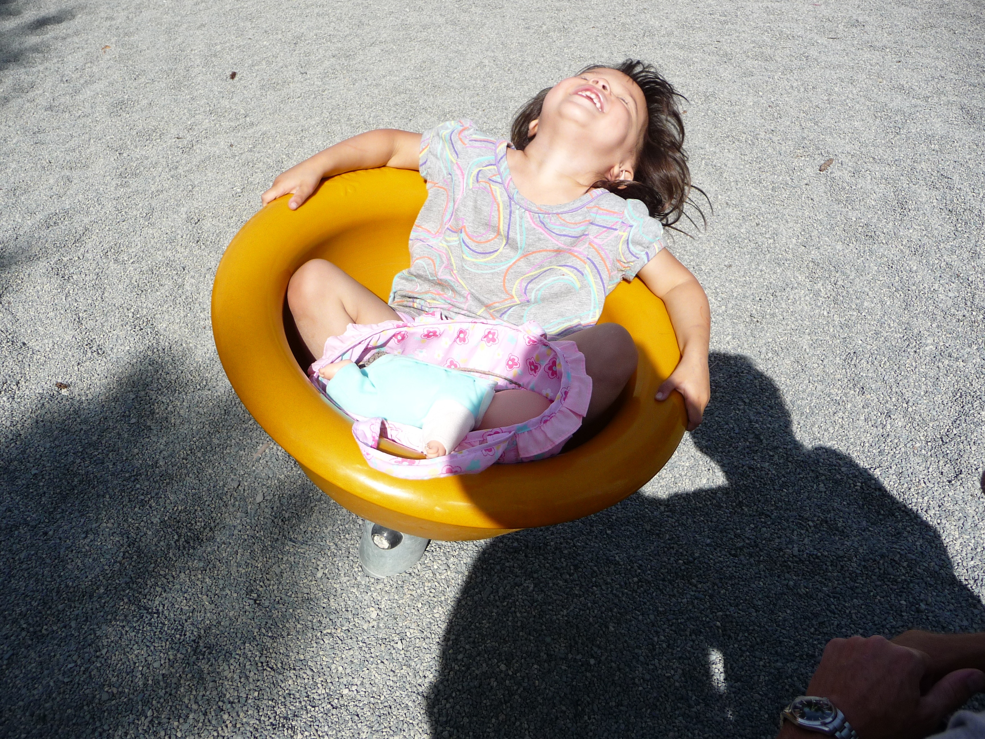 of fun jumping in the pool with her floatie suite on and the hot tub