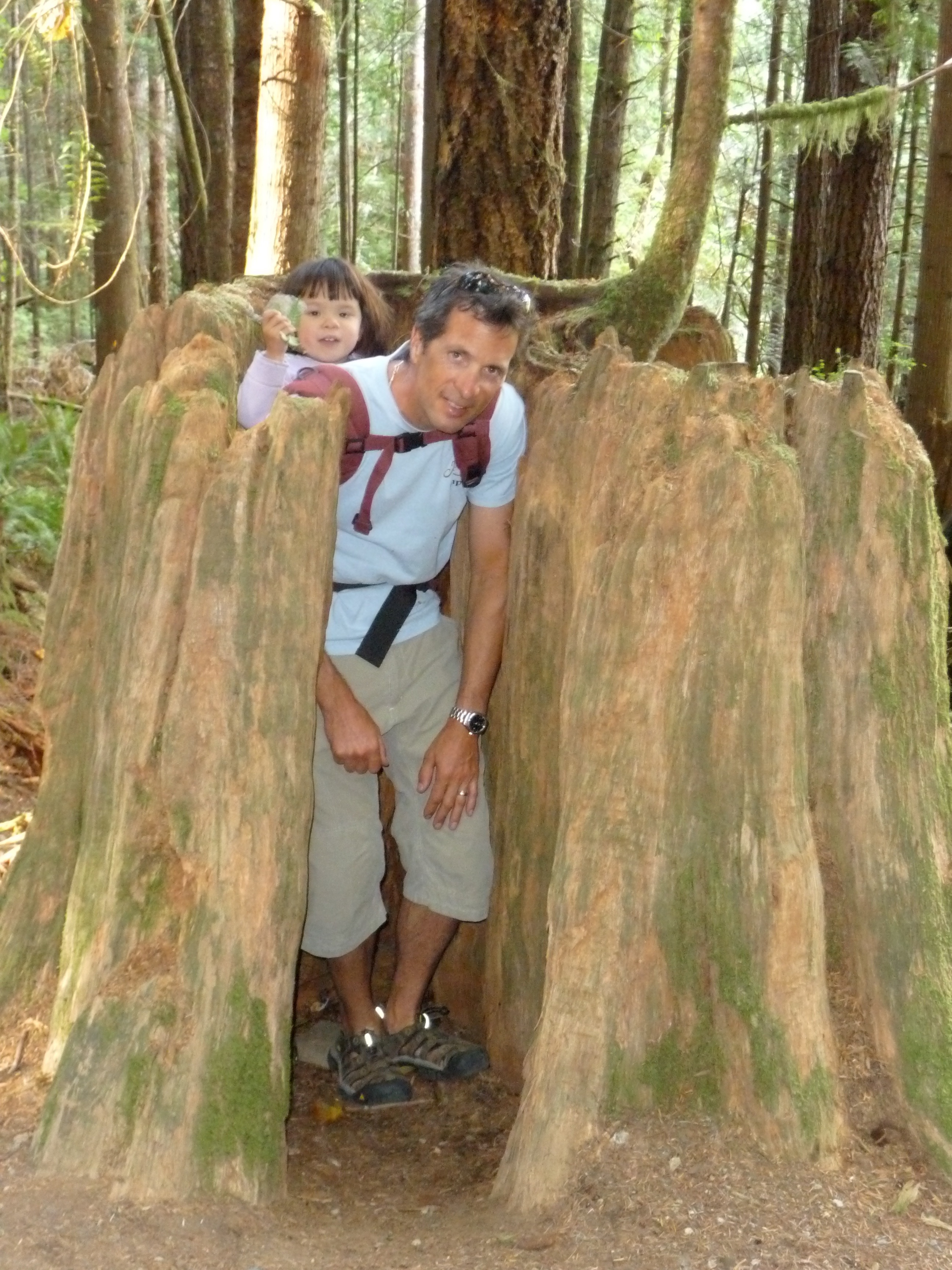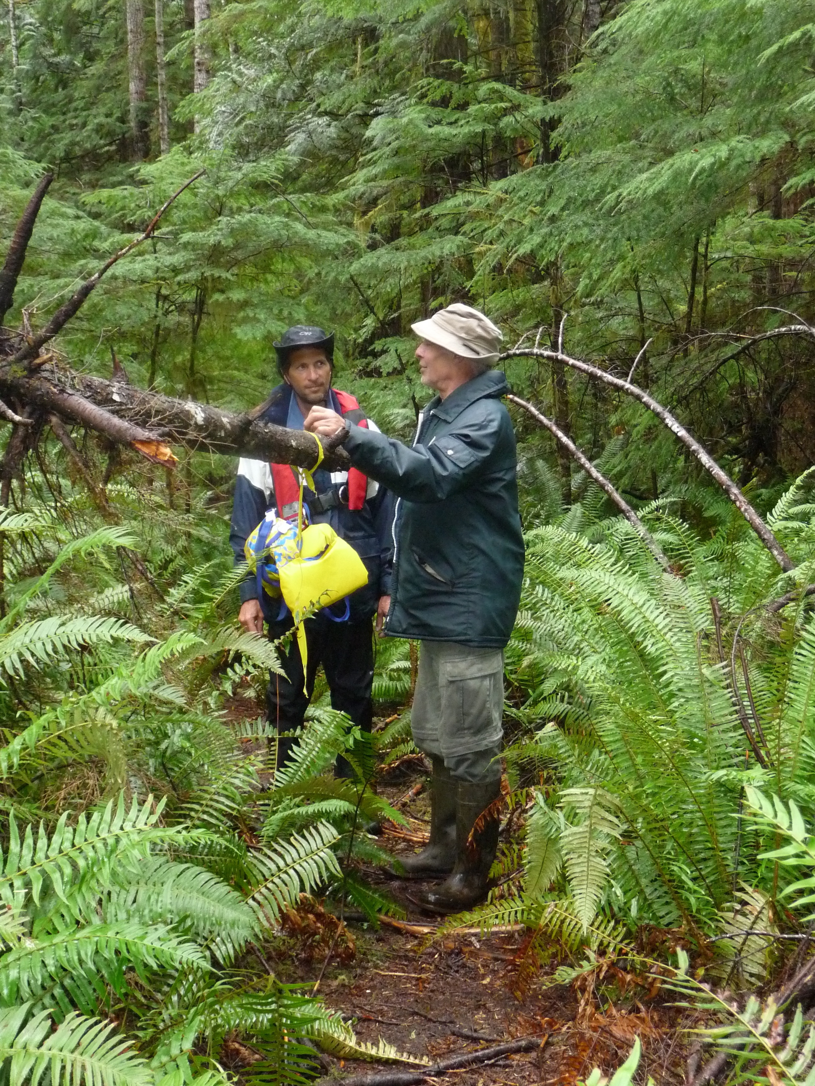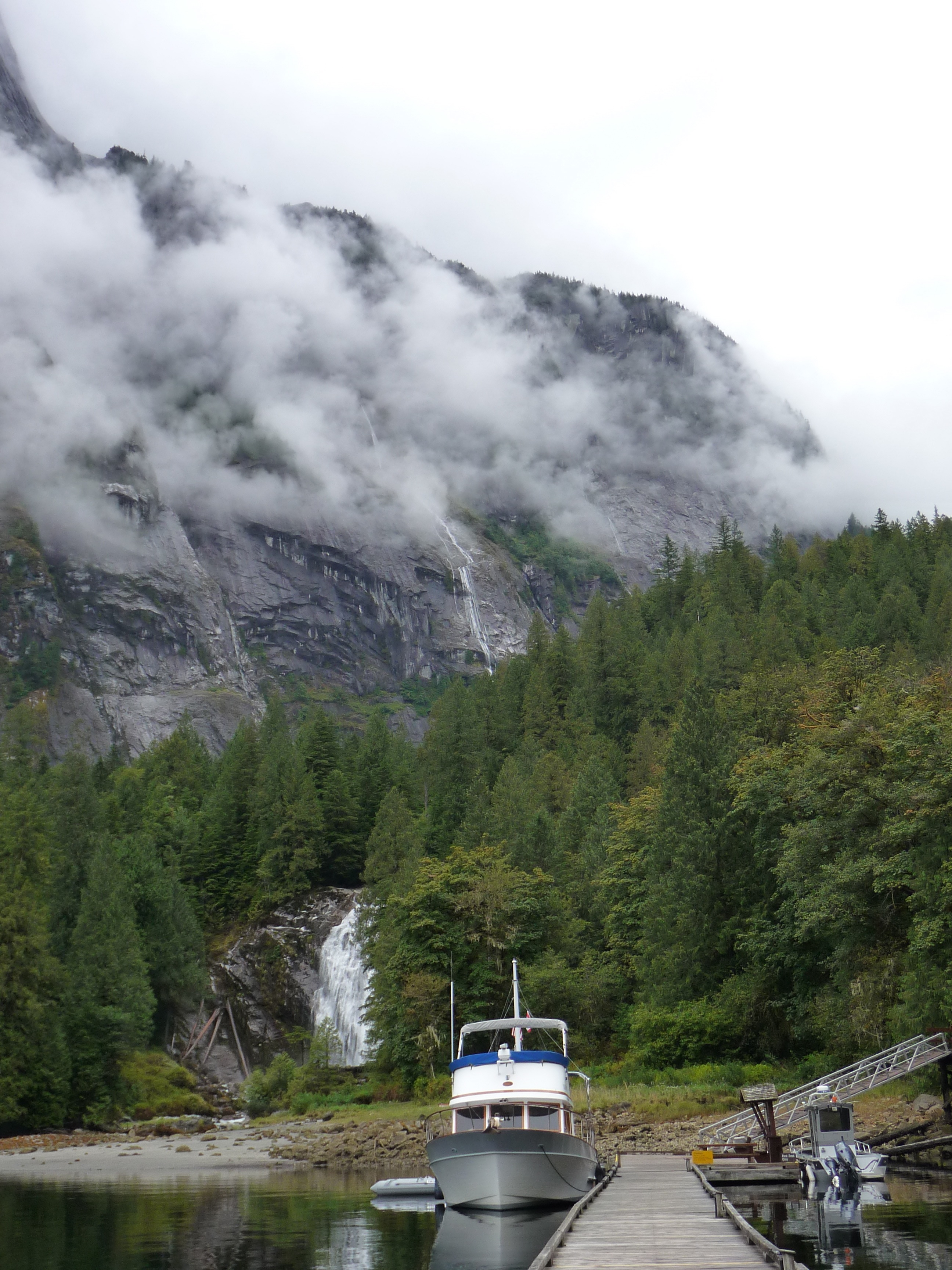 Nice sunny day, but not enough wind for sailing as we departed Cortes Island. We followed Klaus to a protected bay on Quadra Island and tied along-side s/v Mariposa. Klaus uses a mooring ball with 2 stern ties to shore to secure his boat, then takes his dinghy to shore and walks a short distance to his house. Since Jacintha just went down for a nap, Klaus gave us directions for getting to his house and we would meet there later. Once we got to his house, Klaus took me around his property which has breathtaking views of Hoskyn Channel. Karen and Jacintha stayed behind with Mita, Klaus's wife, who was preparing dinner. Klaus was a master stone mason and did most of the construction of the house including a two-story, 5-sided brick fireplace hearth and outside a stone arched gate entrance. After a wonderful meal, we hiked back to the boat with departing gifts of banana bread, plums, Chanterell mushrooms, and toys for Jacintha. Klaus had promised to see a doctor the following day. [note--we keep in touch with Klaus and Mita and they are both in good health. His doctors agreed that he probably had a TIA while we were with him on his boat.]
