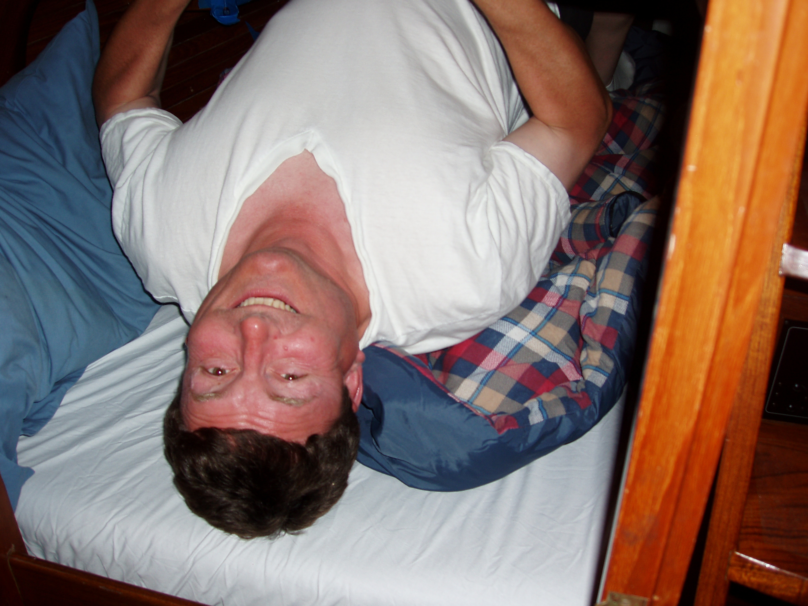 is crawling out of the aft berth which he occupied