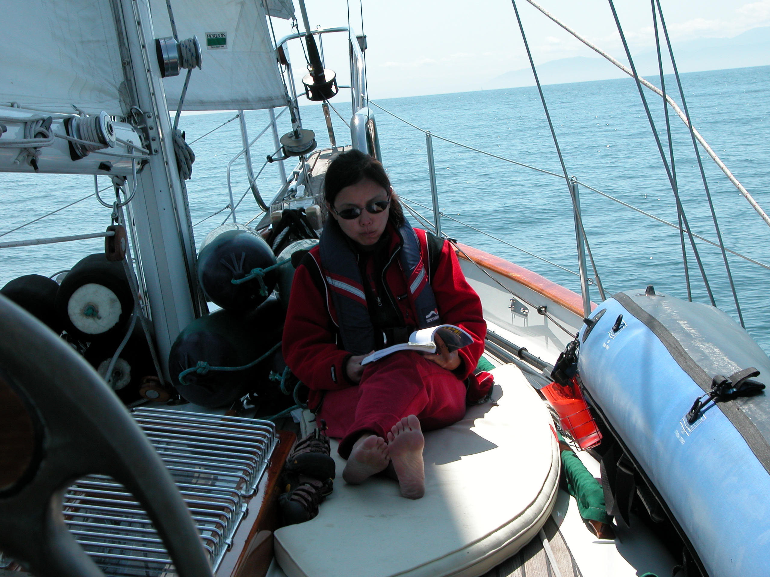sails and tied the wheel, making minor adjustments now and then. We