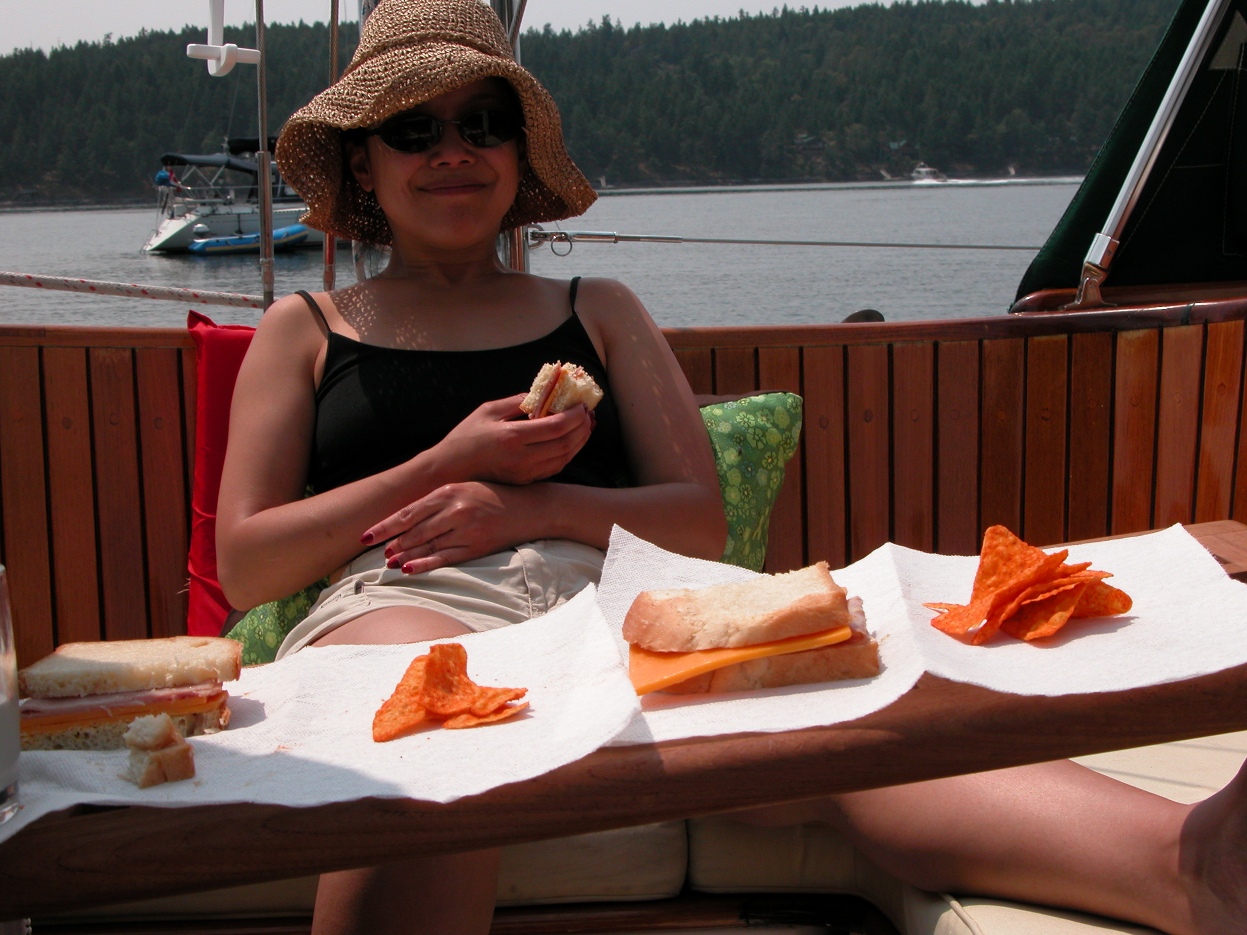 After the wedding day, some people spent another day on the island so we took them out for a sail. We sailed north in Haro Strait along Stuart Island to the Turn Point Lighthouse, then spotted whales on the way back. The weather was sunny and warm. Guests included Sue, Ian, Nancy, and Sophie from Australia, and Kit from Seattle.