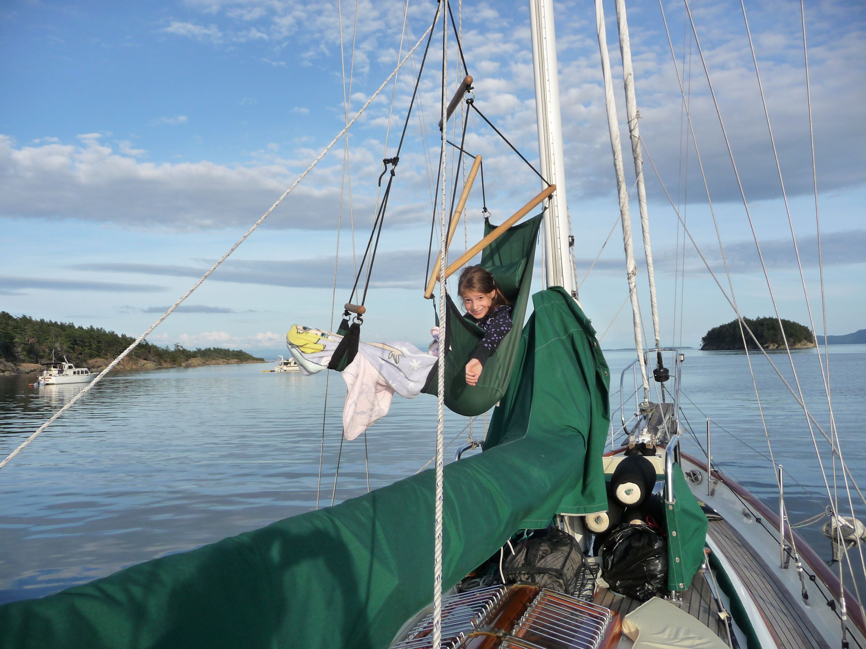 sails going down Admiralty Inlet under sunny skies. Stayed